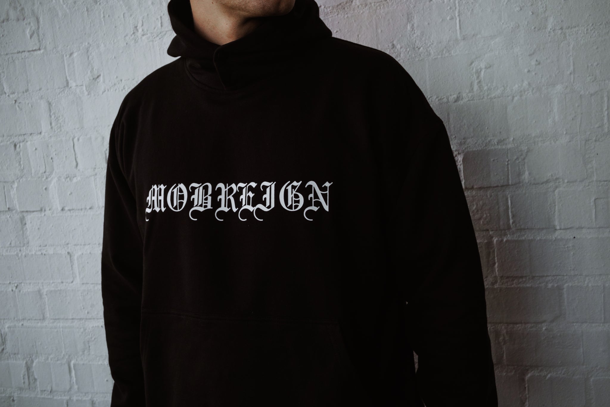 Black slightly oversized fit hoodie in a heavy weight jersey cotton. Super soft, pre-shrunk and piece dyed for the ultimate jersey. Ribbed hem & cuffs. Falling Angel graphic branding across back and MOBREIGN logo across chest.