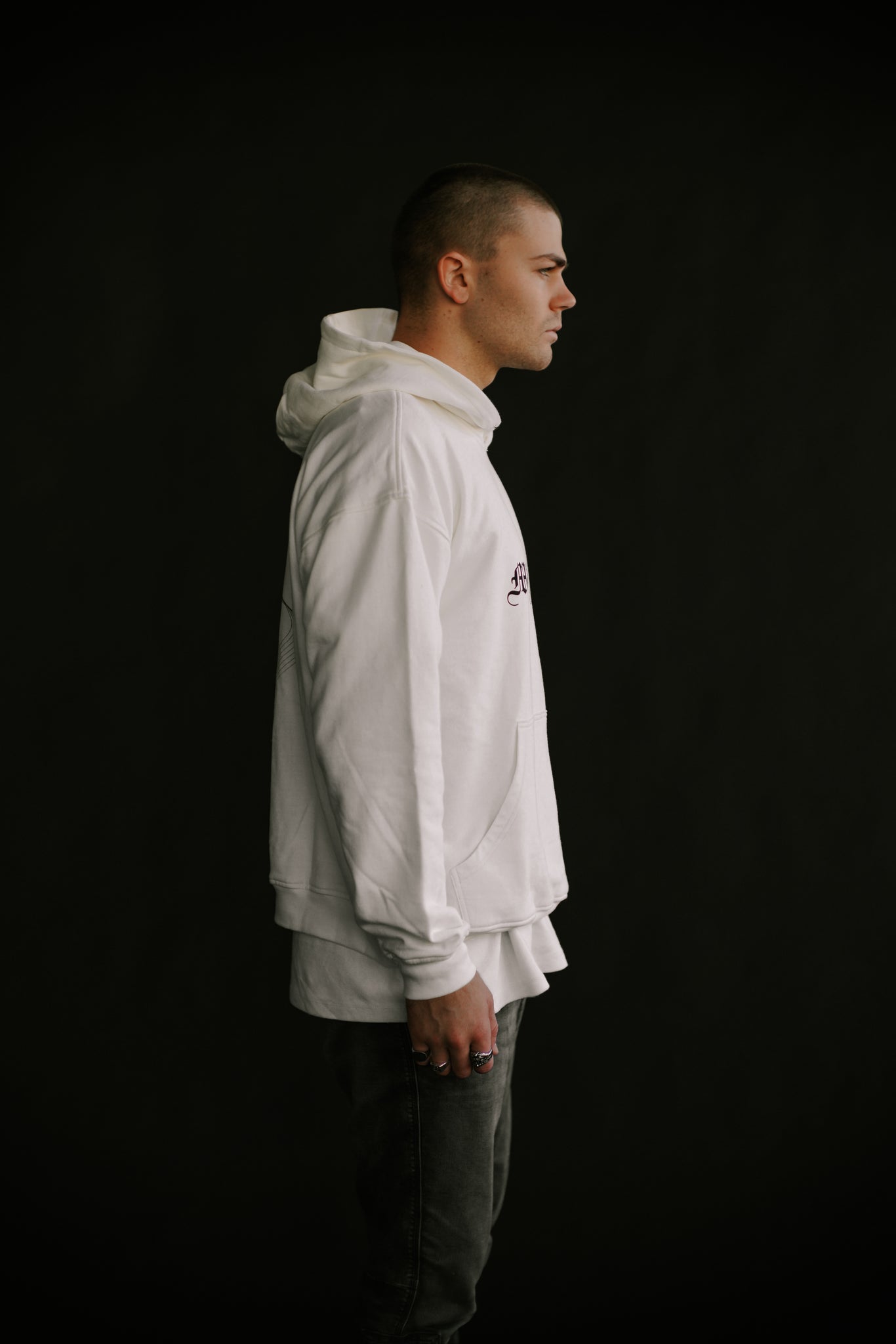 Vintage White slightly oversized fit hoodie in a heavy weight jersey cotton. Super soft, pre-shrunk and piece dyed for the ultimate jersey. Ribbed hem & cuffs. Falling Angel graphic branding across back and MOBREIGN logo across chest.